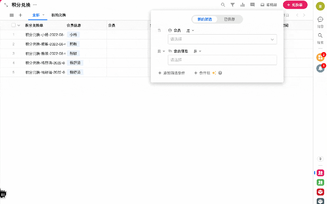 同样类似的做法还有明道云,用户能够自行保存筛选条件,这样高效、简洁~