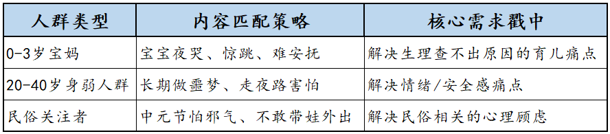 ②复制细节微调:针对宝妈提“夜哭郎”,针对身弱人群提“被噩梦缠身”,针对民俗党提“农历七月带娃乱逛=招灾”;
