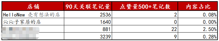 如下图,4家店铺的共同特征:近90天内卖货笔记点赞量500+以上的笔记占比全都不足3%,整体笔记的流量数据偏低,无单篇“大爆款”,却靠“量效结合”撑起可观销量。
