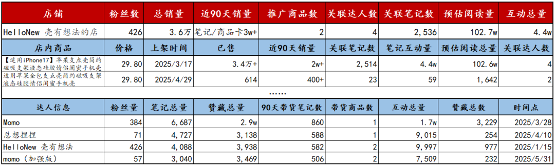 店铺主要售卖款式多样的苹果手机壳,近90天靠“笔记/商品卡”总销量3.6万+,实现了破百万的销售。