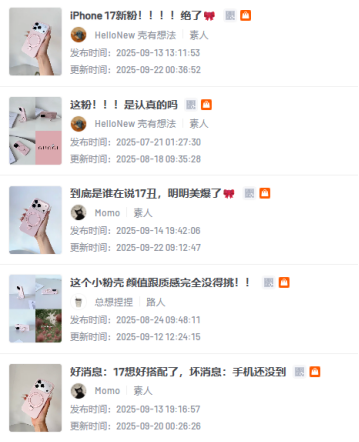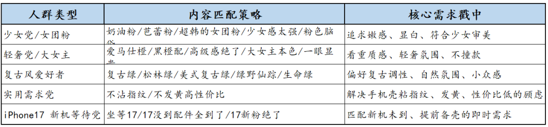 通过“颜色标签、风格定位、痛点解决”的多维角度,将目标人群从“iPhone17颜值党”扩充至5类精准群体,每类内容均戳中核心需求: