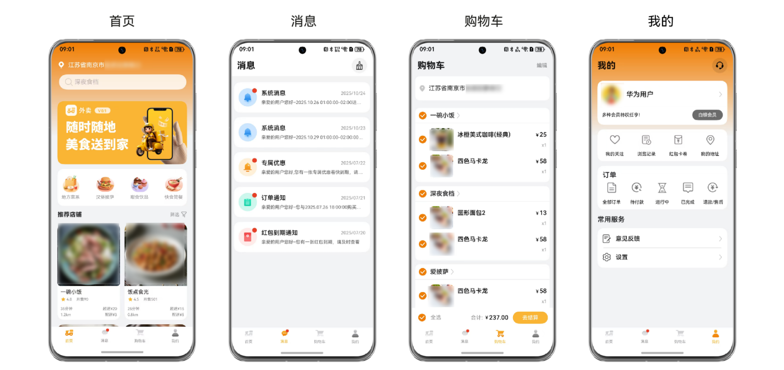本模板为外卖类应用提供了常用功能的开发样例,模板主要分首页、消息、购物车和我的四大模块。本模板已集成华为账号、支付宝登录、微信登录等服务,只需做少量配置和定制即可快速实现华为账号的登录、外卖等功能。