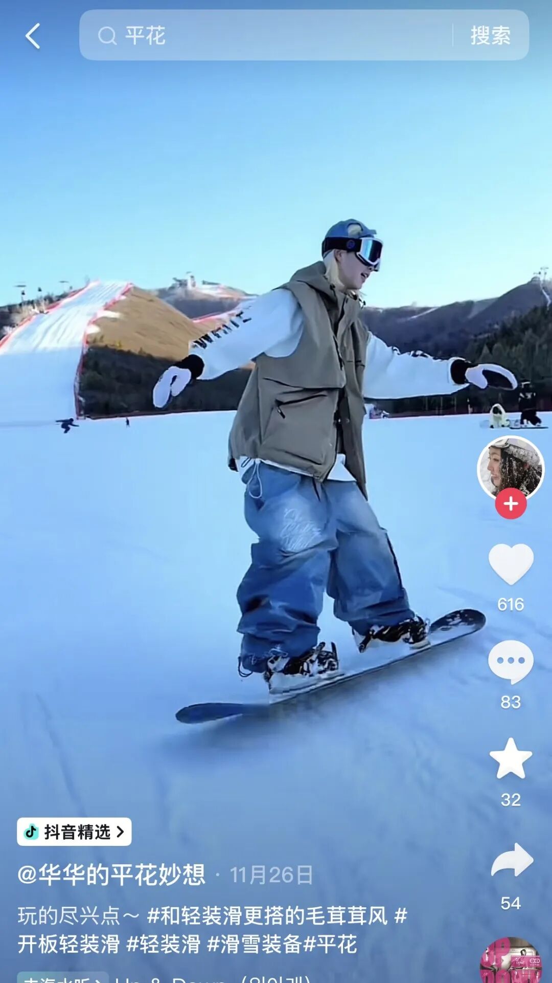 传统“重装滑”装备厚重,讲究功能至上,更契合高竞技需求,而“轻装滑”装备,更偏向轻量化与简约设计,主打轻装上阵,实现跨场景的自由切换。我们同样可以从抖音热门滑雪内容来感受:
