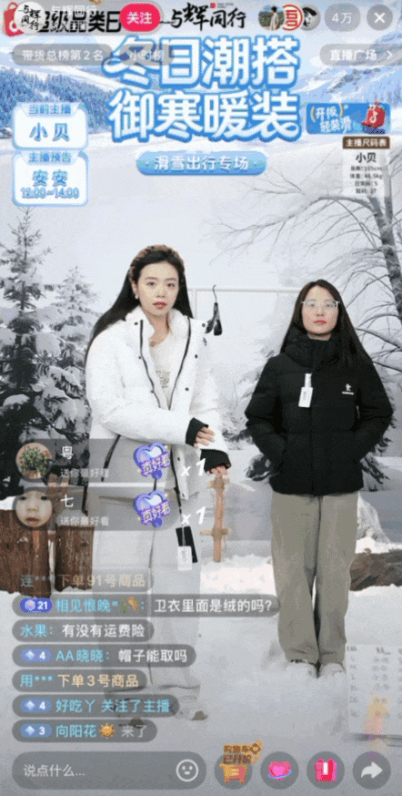 庞大的流量迅速转化为市场动能,直接促进了相关品类销量显著攀升,“轻装滑”趋势带动羽绒、滑雪等类目支付金额同比增长54%。东方甄选、与辉同行、交个朋友等头部直播间纷纷开设趋势种草专场;骆驼、雪中飞等品牌直播间内,相关商品交易额表现亮眼,印证了“轻装滑”背后可观的市场潜力。