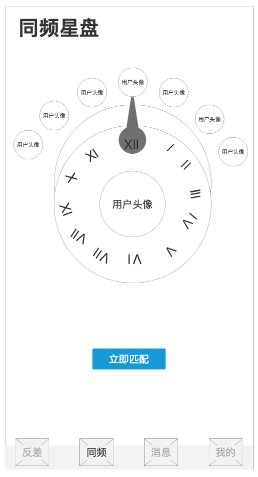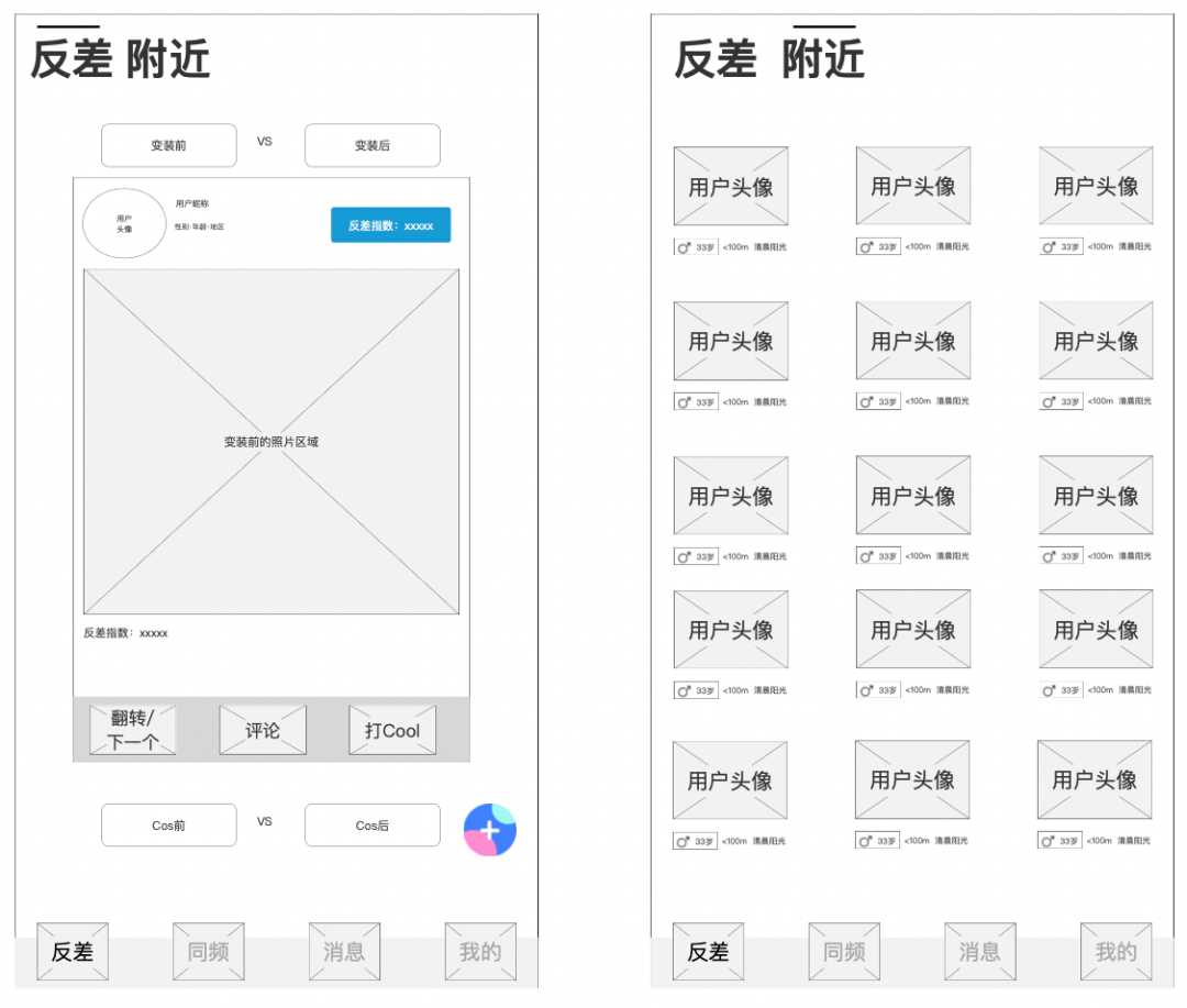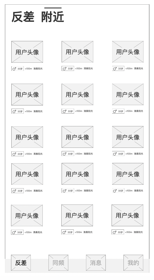 这次我把整个产品的结构都想清楚了,底部4个tab:反差、同频、消息、我的。