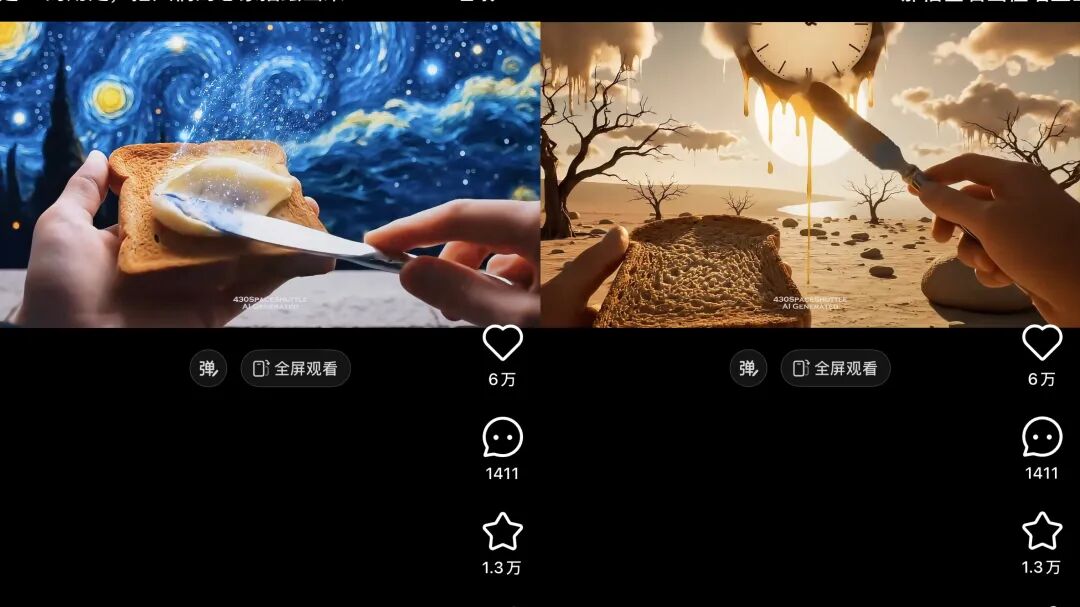 这类视频中不乏一些创意想法,比如@AI造梦研究所 从名画中提取“夹馅”,舀一勺《向日葵》,或是《星月夜》涂抹到面包上,新奇的设计让不少用户感慨,“这才是AI应该做的东西”。目前,这条笔记在小红书收获了超6万次点赞。