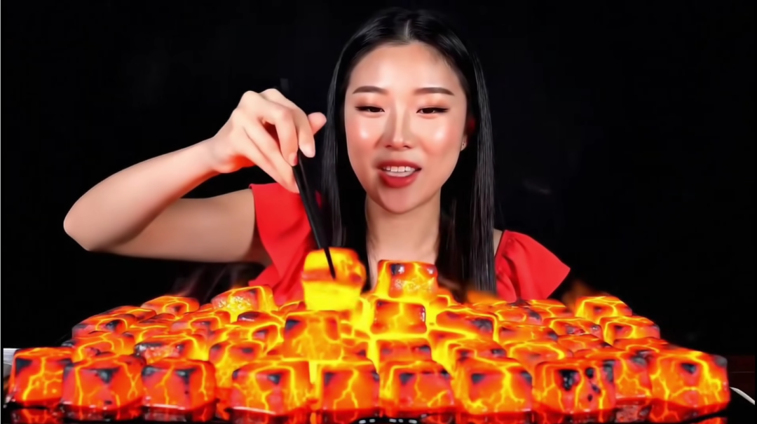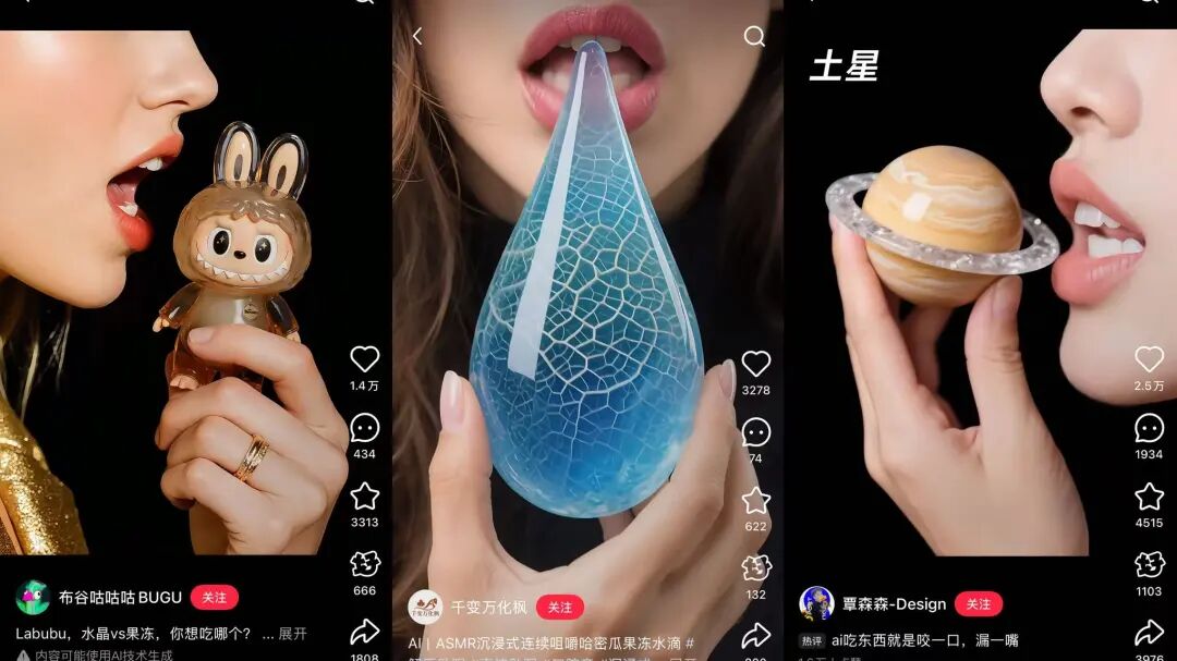 你可能也刷到过这样的视频:尚未凝固的熔岩、镶嵌有晶钻的马卡龙、果冻质感的labubu,以及一系列玻璃水果,被AI主播放入口中,若无其事地咀嚼,在咬碎“食物”的瞬间,玻璃会像冰块一样碎裂,熔岩则如“爆浆”一般流出岩浆内馅。