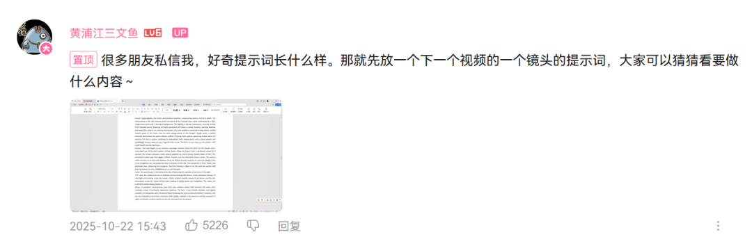 在繁杂的AI模型之外,撰写提示词则是更为复杂、高强度的工作。@黄浦江三文鱼 曾在评论区晒出过自己的一段提示词,一个短暂的镜头就要花费差不多一页word,假如场景中存在特效,文字量还需要再增加。