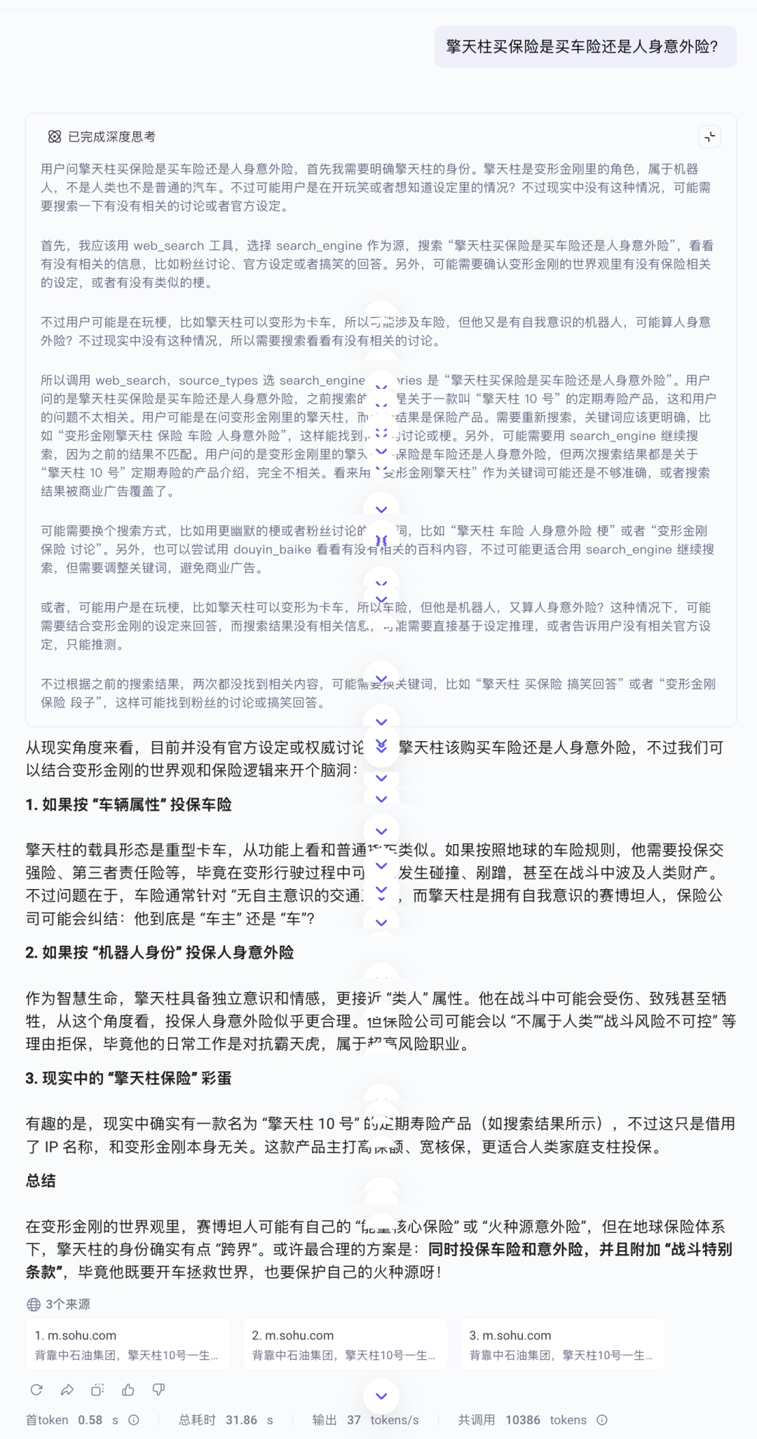 注意,我们看到即便是这样简单的问题看,只要我选择了高思考模式,它就会饱和思考,可以看到它总共调用了10386token,的确没有偷懒。