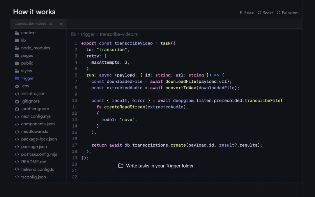 我特别欣赏 Trigger.dev 在代码组织方面的设计。开发者可以像编写普通的 TypeScript 函数一样编写任务代码,但这个函数实际上运行在分布式系统中,具有微服务的所有优势。用他们自己的话说:”你有一个 TypeScript 函数,这就是你的微服务。你像调用函数一样与它交互,但它像微服务一样运行。”这种抽象层次恰到好处,既保持了代码的简洁性,又提供了生产级系统所需的可靠性和可扩展性。