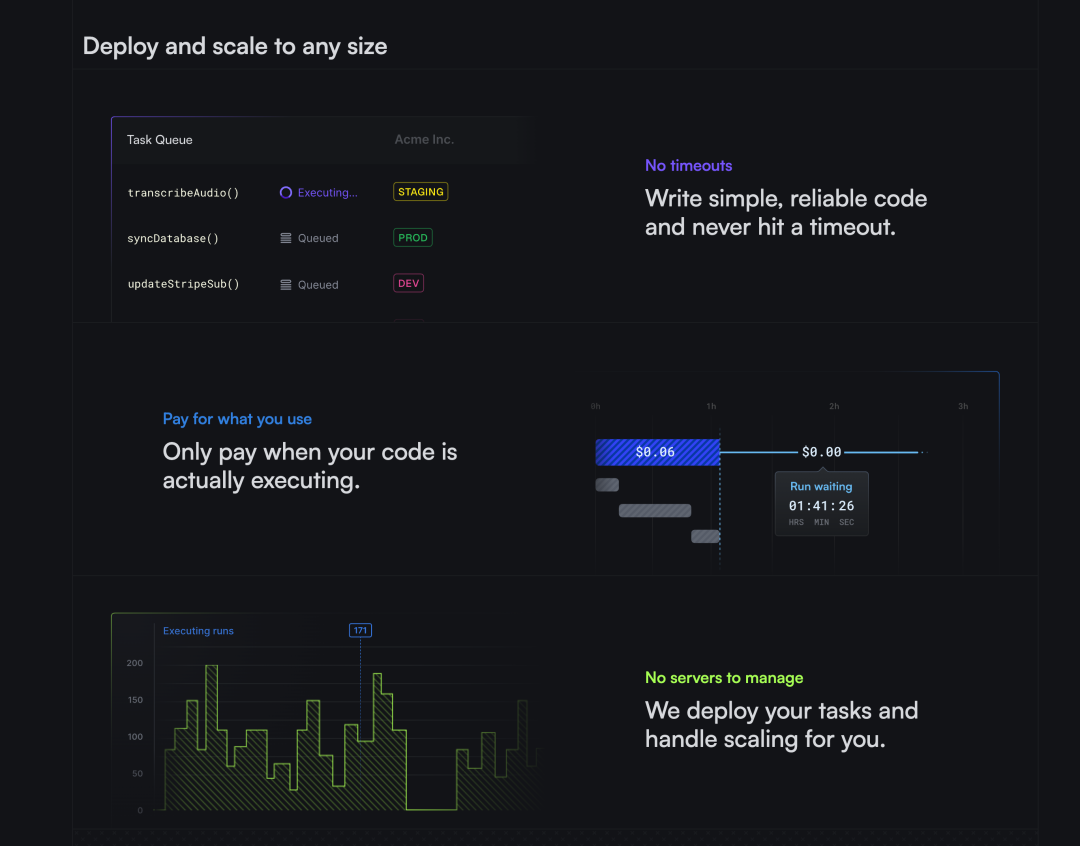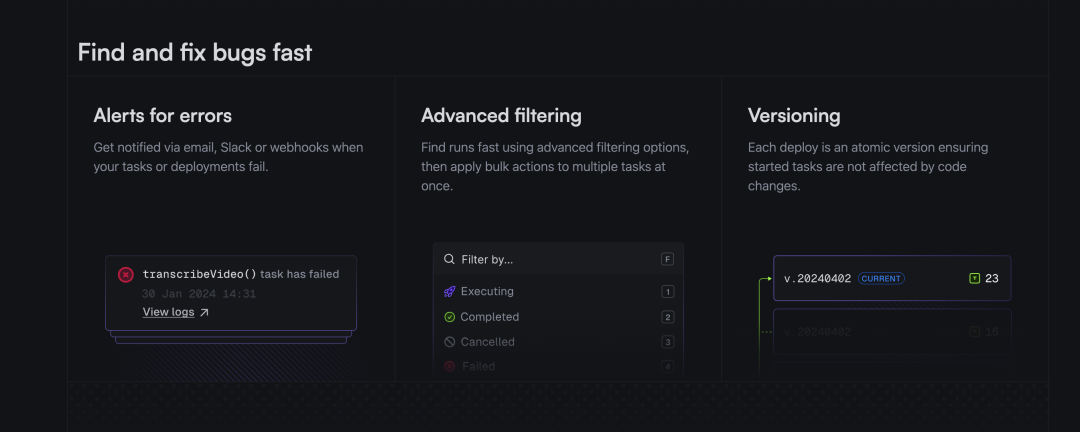 这段话道出了 Trigger.dev 的另一个关键优势:开发者可以在同一个代码库中编写任务代码,而不需要维护单独的微服务仓库。这大大简化了开发流程,减少了上下文切换,也让团队协作变得更加容易。同时,当任务执行时,它们运行在 Trigger.dev 的云基础设施上,可以获得强大的计算资源,而不会影响主应用的性能。