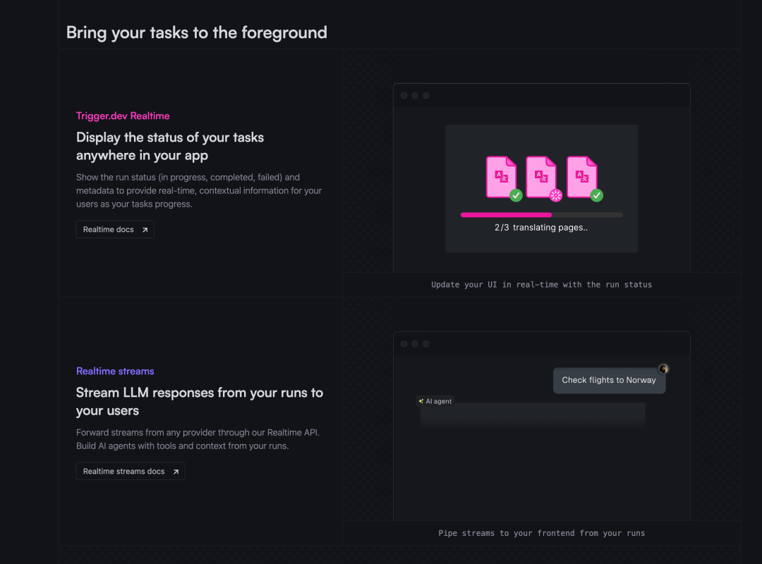 更糟糕的是,这些基础设施代码会占用大量工程资源,而这些资源本可以用来开发真正为用户创造价值的功能。这就是为什么越来越多的开发者转向 Trigger.dev 这样的平台:它让你可以专注于构建 AI agent 的核心逻辑,而不是被基础设施问题困扰。
