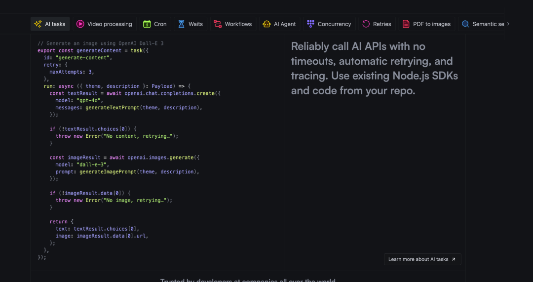 这里的关键在于,开发者不需要担心如何实现这个队列系统,不需要考虑如果任务失败了该怎么办,也不需要处理大量并发请求时的资源分配问题。Trigger.dev 把这些复杂性都隐藏在了简洁的 API 背后。开发者只需要定义任务的逻辑,剩下的交给平台处理。