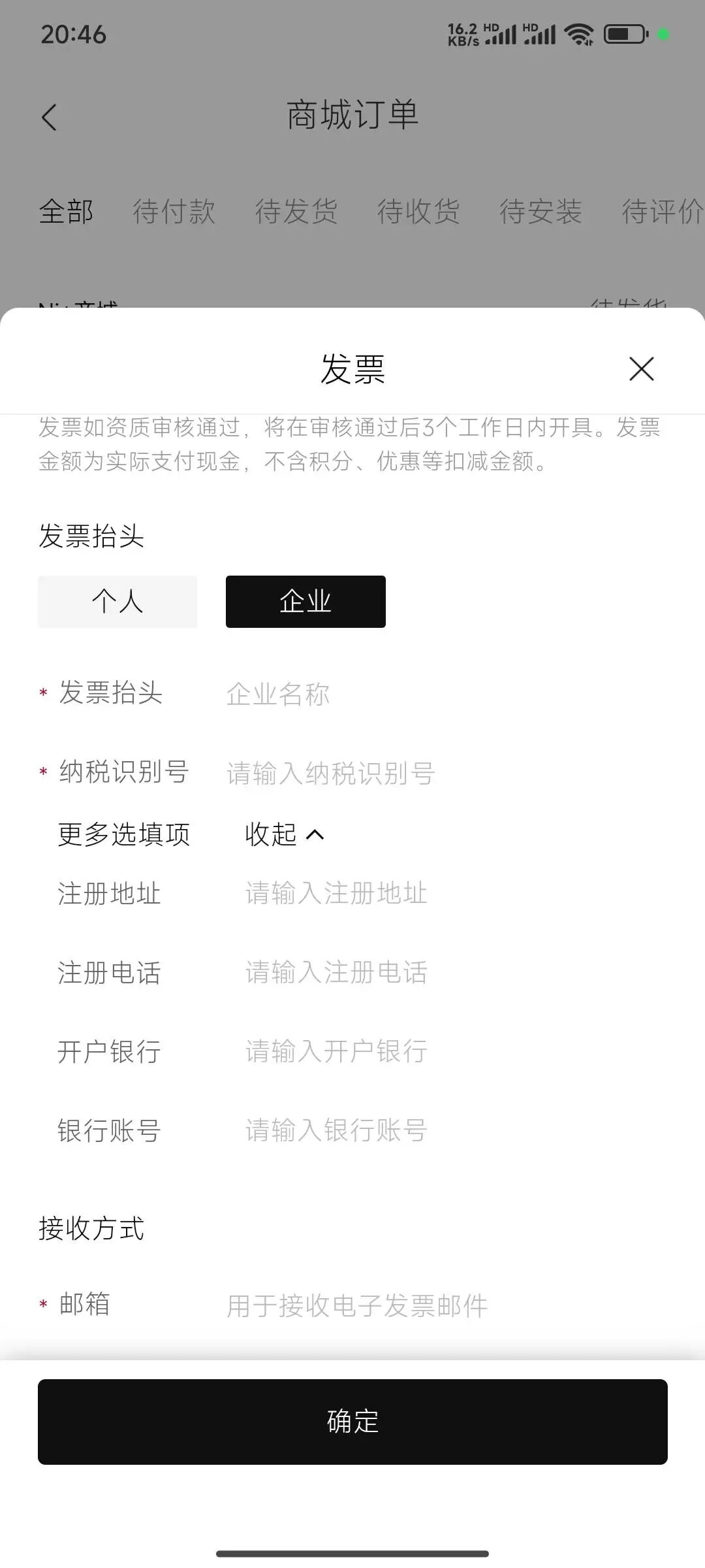 - 手机号码:用于接收电子发票,邮箱和手机号码要求至少填写一项。