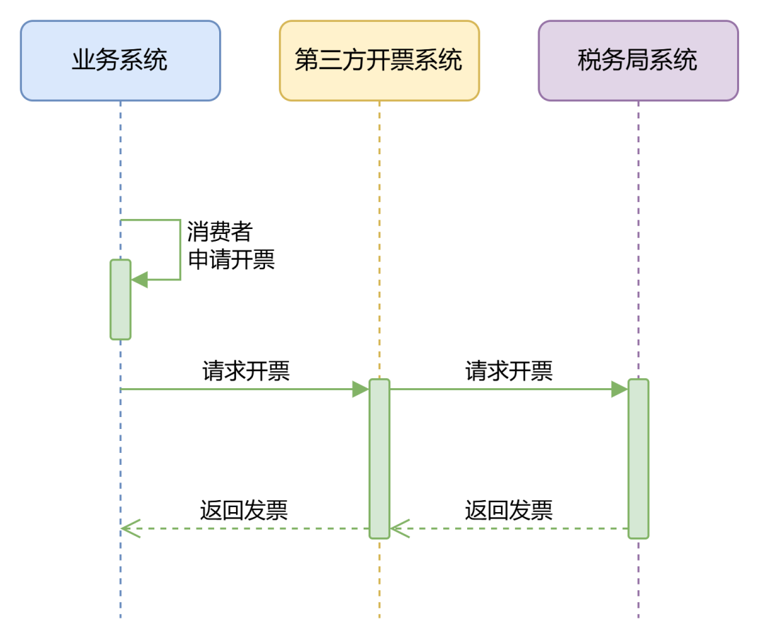 一个简单的开票动作涉及到以上三个系统的联动和数据交互,开票的基本流程如下图所示。
