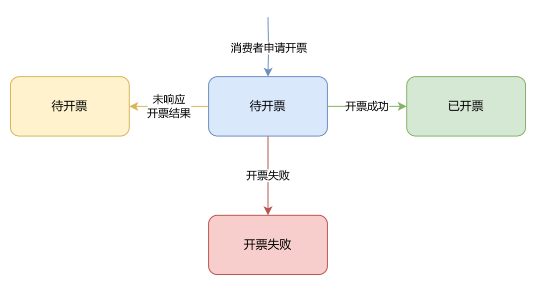 - 待开票:在消费者提交开票申请后,在开票系统响应开票结果前,发票信息会处于当前状态,在实际的数据交换过程中,开票的结果并非只有成功和失败,有可能是开票信息提交后,一直得不到第三方开票系统的响应,比如第三方开票系统服务器断联等情况,在这种情况下,开票系统会一直“挂”在“待开票”的状态下,直到第三方开票系统有响应结果为止。