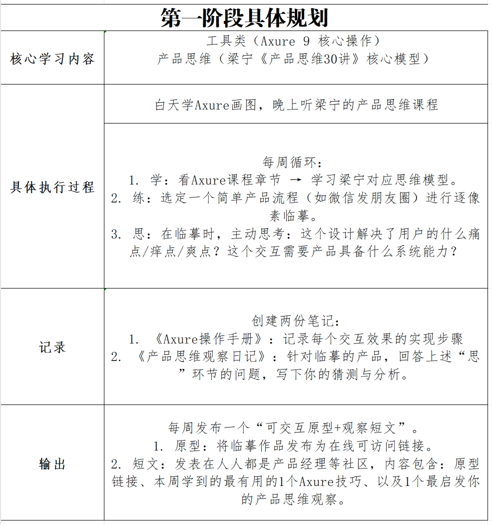 今天,我想完整分享这份 【产品小白90天系统成长计划】 ,并邀请你一起见证和监督我的旅程。我会每周更新我的学习产出和思考,希望也能给同样起步的你,一点参考和动力。