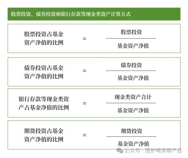 背景三:基金持仓结构、仓集中度分析、金持仓股本规模和基金持仓成长性分析;股票、债券、期货、银行存款等现金类资产分别占基金资产净值的比例等(注:计算公式如下图所示)可以将基金持仓结构的变化与基准指数的变化进行对比分析,从而了解基金的资产配置情况与能力。