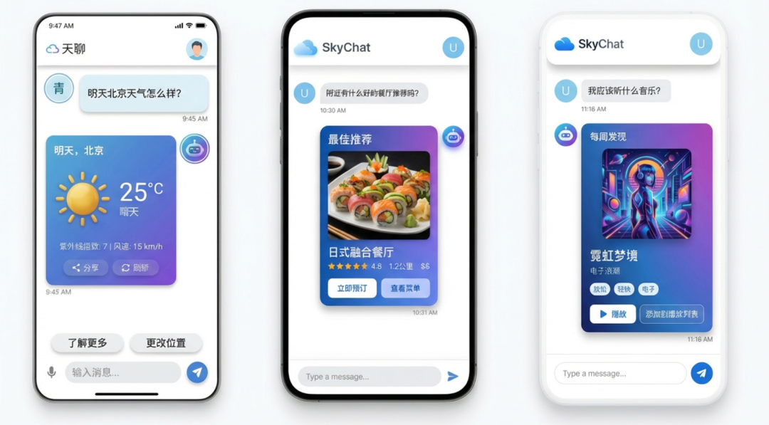 你问它天气,它不说”明天 25 度晴”,而是直接画一个天气卡片。 你让它订餐厅,它不一项项问你,而是直接弹出日期选择器和时间下拉框。 你让它分析数据,它不甩给你一堆数字,而是生成一个可交互的图表。