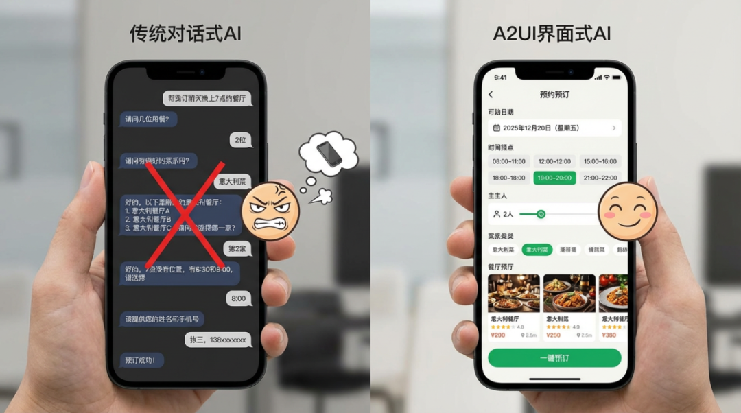 Google 发布的 A2UI 打破大模型三年 “聊天框” 困局,实现 GUI 与 AI 深度融合 —— 问天气生成可视化卡片,订餐厅直接弹出交互表单,8 轮对话压缩为 3 次点击。这场交互代际跃迁,让 AI 从 “会说话” 变 “会做事”,成为其走向大众的关键一步。