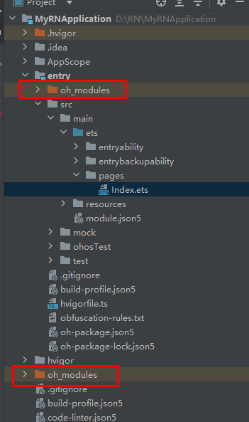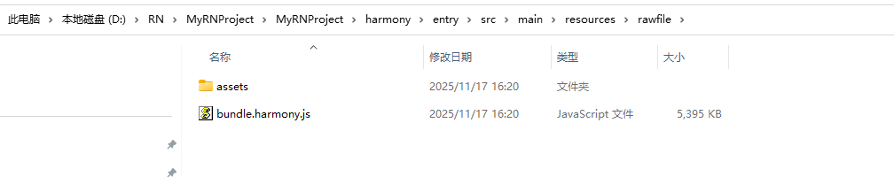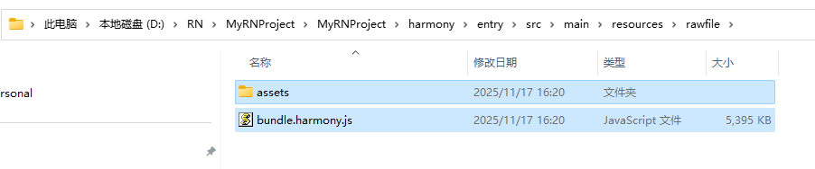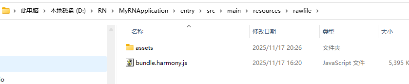 本地加载 bundle。将MyRNProject\harmony\entry\src\main\resources\rawfile目录下的 bundle 文件和 assets 文件夹粘贴复制到HarmonyOS工程MyRNApplication\entry\src\main\resources\rawfile路径下,在 entry/src/main/ets/pages/Index.ets 中使用。
