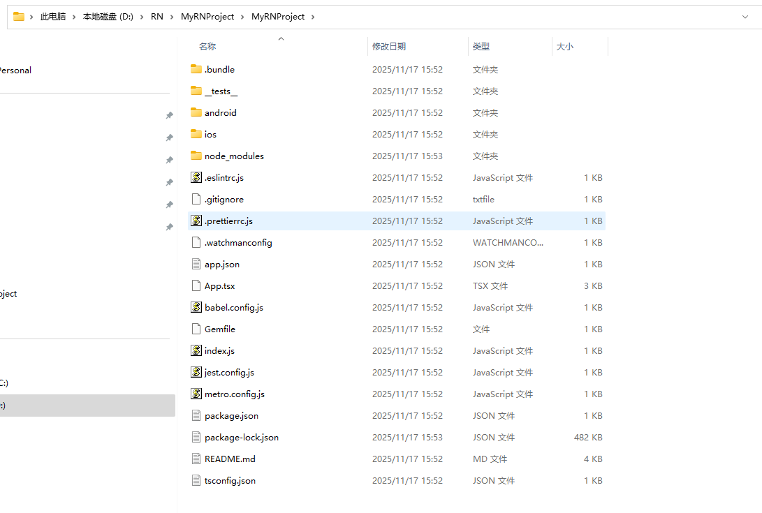 运行成功后会在D:\RN目录下创建MyRNProject文件夹,文件夹目录结构如下: