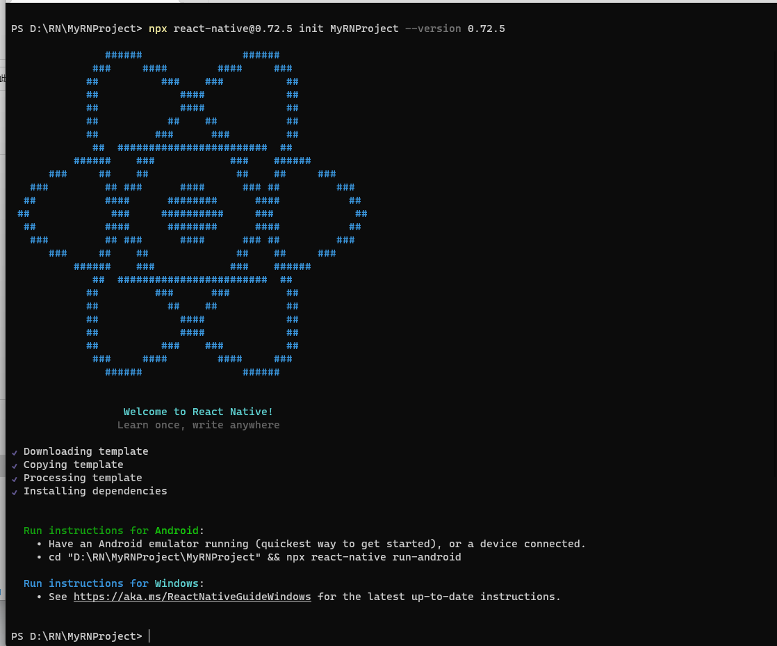 npx react-native@0.72.5 init MyRNProject –version 0.72.5