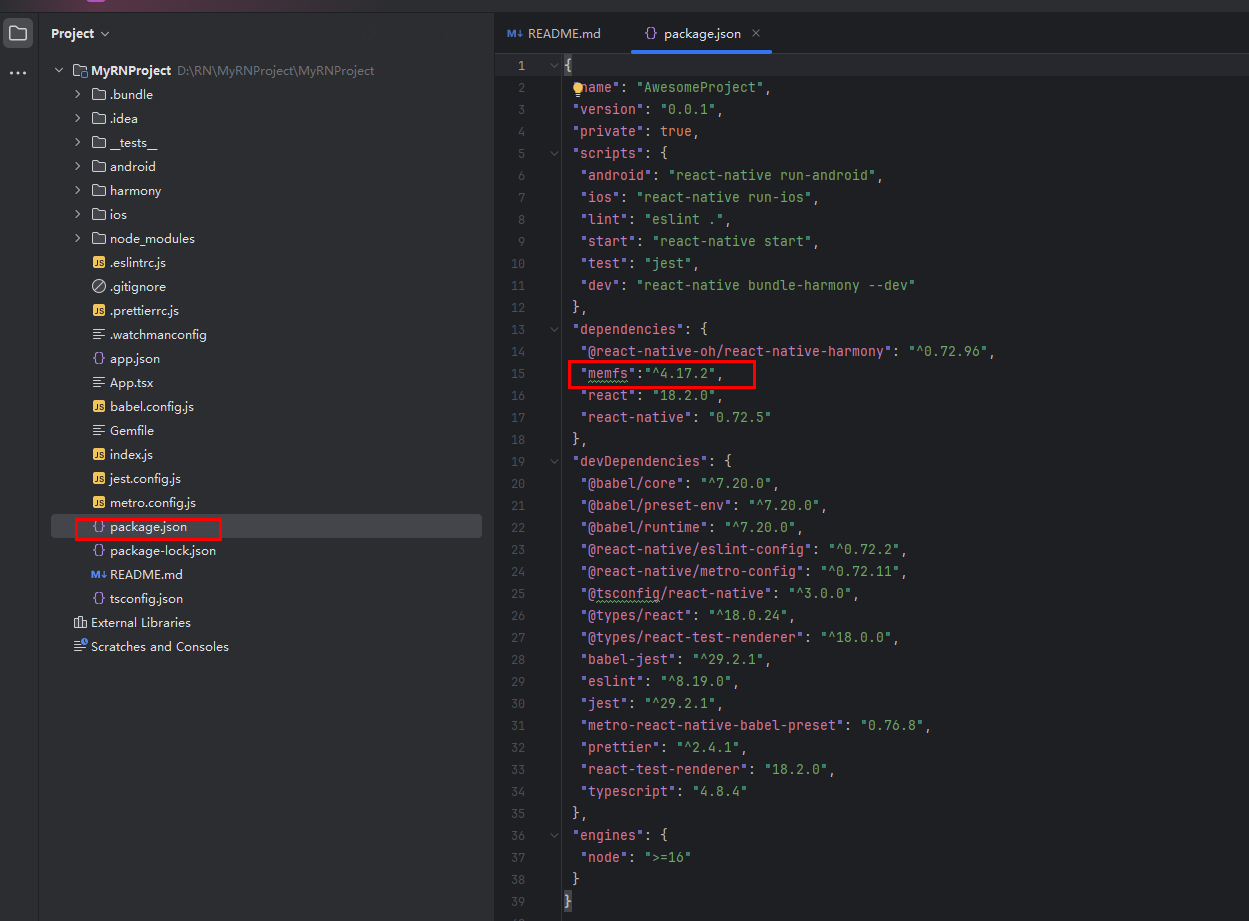 打开 MyRNProject 目录下的 package.json,在 scripts 下新增 OpenHarmony 的依赖, 添加依赖后的package.json文件如下所示。