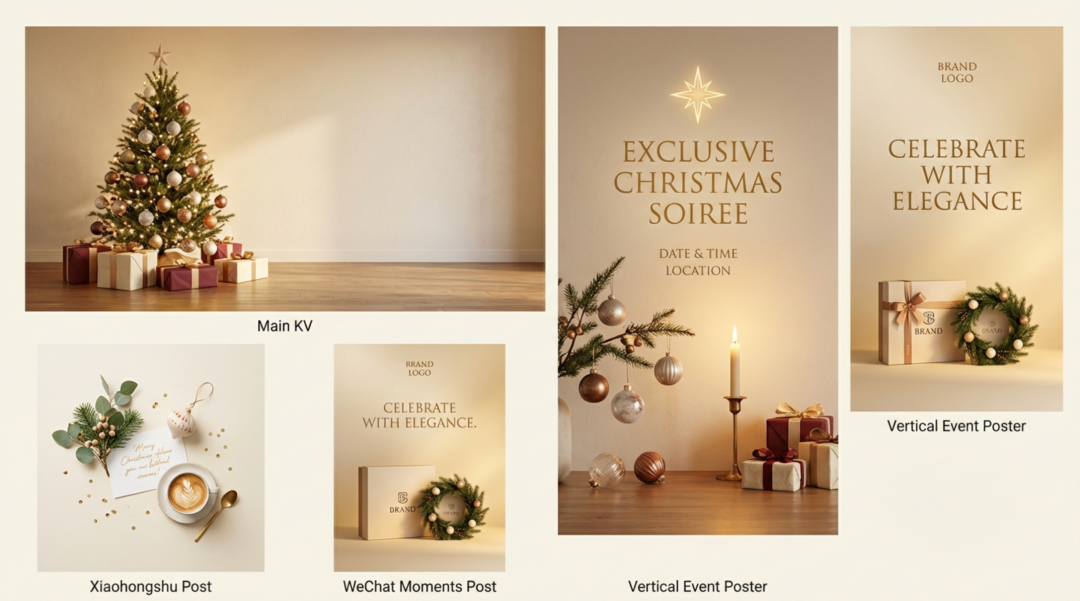 这种成套输出带来的变化,在实际项目里非常直观。每一张图该怎么用、会出现在哪里,不需要再事后补想象。不管是圣诞、跨年还是新年,不同主题下沿用的是同一套设计骨架,修改和调整都发生在同一个结果之上。