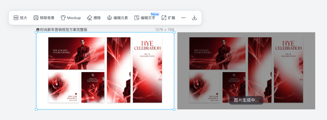 生成完成后,整套设计会保留在同一个画布中,直接就能继续操作。放大、移除背景、Mockup、编辑元素或文字,都在上方工具栏里随手完成,修改发生在原结果之上,不需要重新开始。