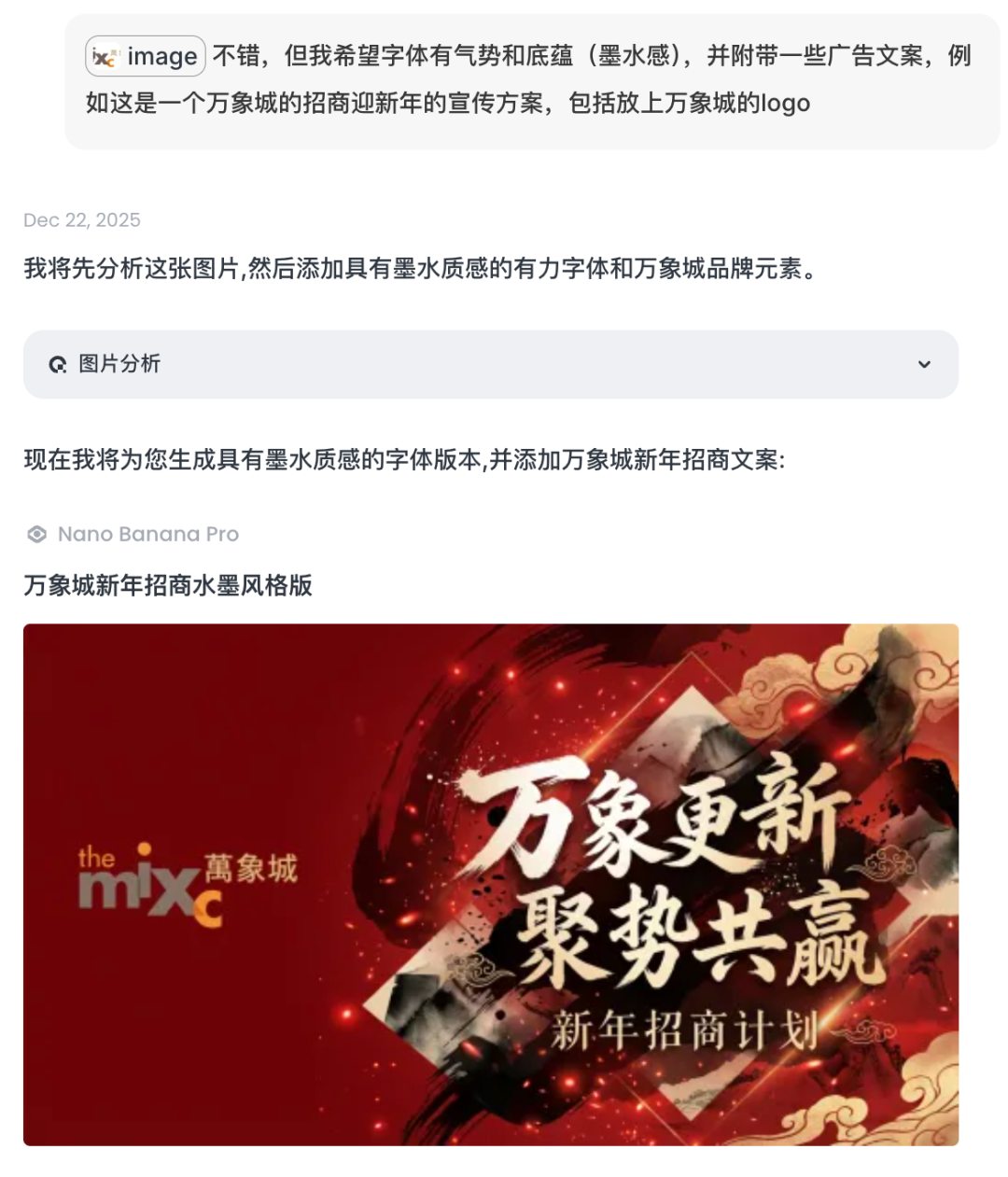 在 Lovart 里,只需要明确提出这样的场景需求——指定品牌对象、调整为更具水墨感和力量感的字体风格,并加入招商语境的文案,系统就会在原有结构上完成整体升级。