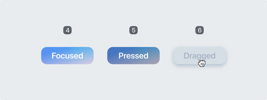 这个状态用来提示用户,当前正在按住并移动某个元素。比如被按压的按钮,容器和文字会有鲜明对比;被拖动的芯片,也会通过视觉变化,让用户清楚看到它正在被移动。