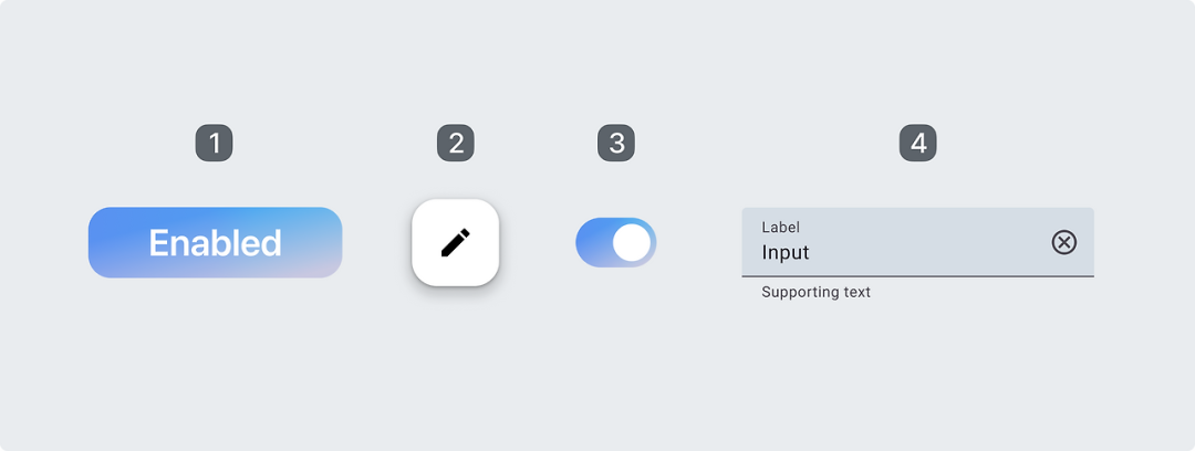 像按钮、浮动操作按钮(FAB)、开关和文本字段这些常见组件,都有各自对应的启用状态样式。