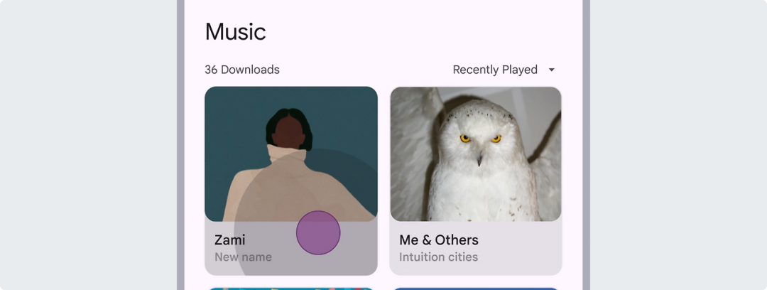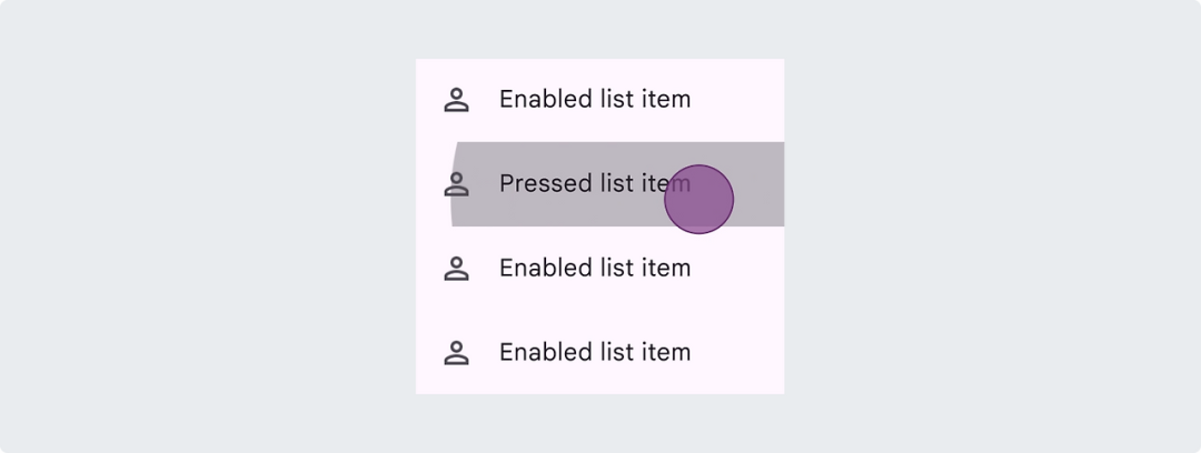 悬停状态的触发很简单——当用户把光标停在可交互元素上时,这个状态就会启动。用来提示悬停状态的低强度表面叠加层,既可以覆盖整个组件,也可以只应用在组件内的部分元素上,还能以圆形的形式,针对性地加在组件的特定区域。