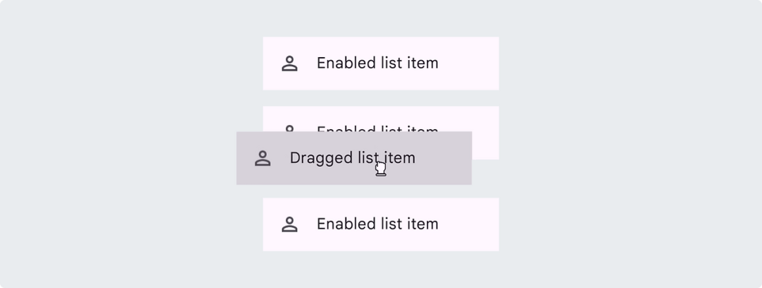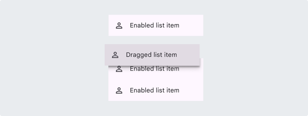 拖拽态的视觉表现要尽量低调,避免分散用户的注意力。我们可以用低饱和度的叠加层来提示这个状态,叠加层既可以覆盖整个组件,也可以只应用在组件内的部分元素上。