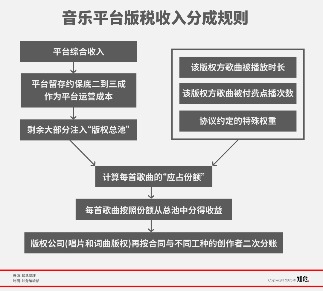 据了解,在音乐行业,版税收入都遵循这样一个大概规则:平台综合收入大概分为两部分,保底二到三成作为平台运营成本,另一多半拿出来,注入“ 版权总池 ”,然后根据每首音乐的播放量、播放时长等因素,计算每首歌曲的“应占份额”,分给唱片、词曲版权方,版权方再按照合同给不同工种的创作者进行二次分账。