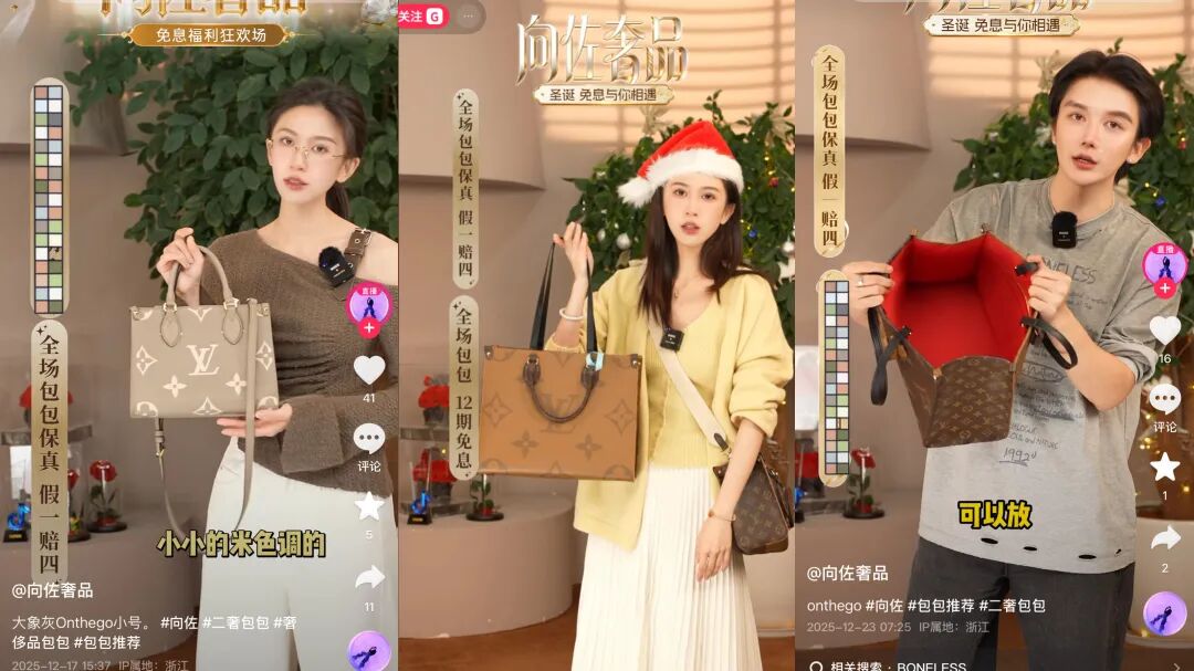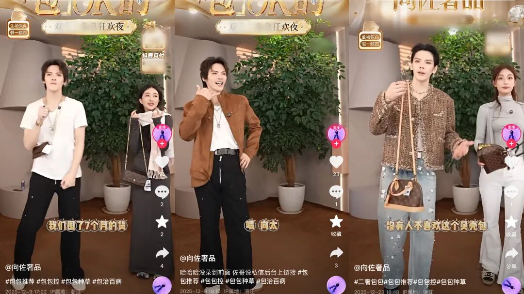 今年11月,向佐正式建立子账号@向佐奢品,专门售卖二奢产品。12月5日,他还拍摄了一支庆祝新号开播的短视频,表示“从货源到选品都是亲自把关,保证每一个包你收到的都是正品真货”,希望“闺蜜们”多多支持。