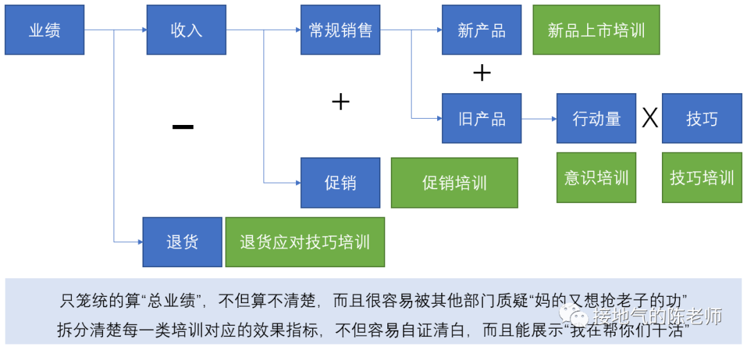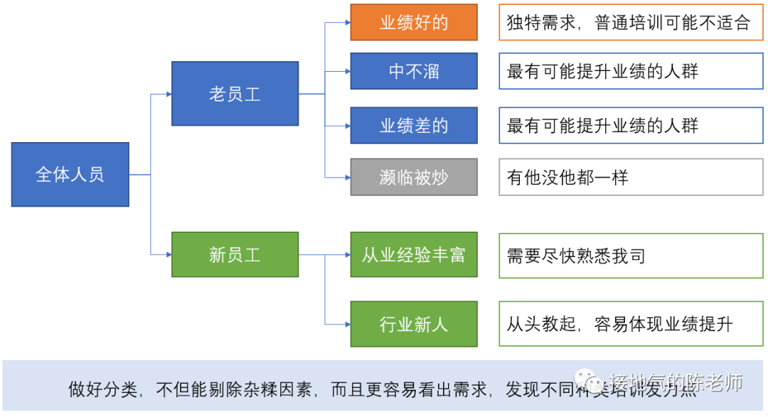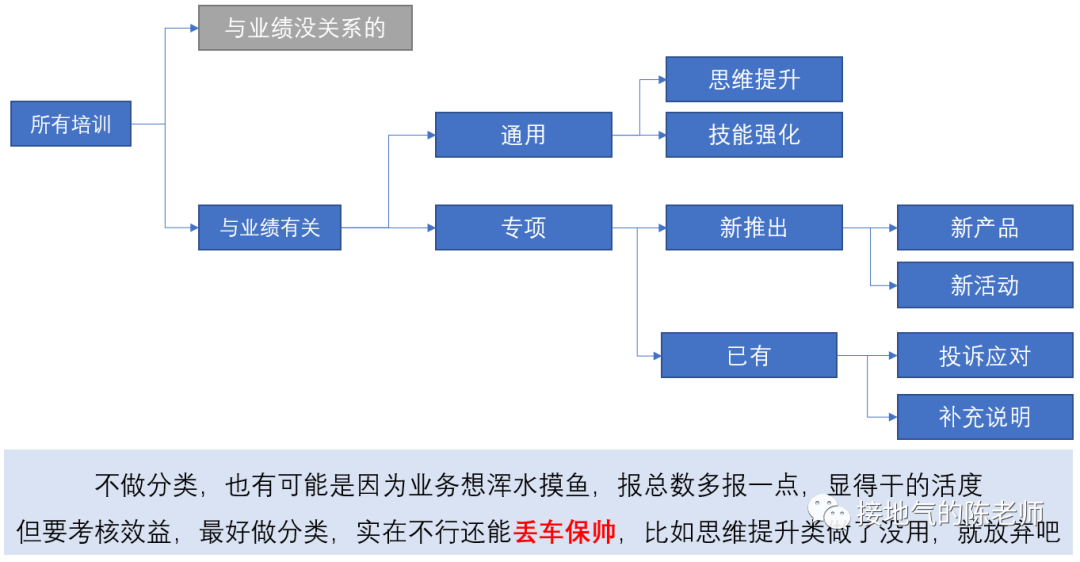 是不是所有的培训都有效果?当然不是啦!日常新员工培训,礼仪培训,公司文化培训,集团领导讲话精神贯彻会……这些都算形形色色的培训,可跟业绩效益一毛钱关系都没有。都混在一起,肯定是泥沙俱下,难以区分。因此需要提前做好分类,把那些可能对业务有用的培训筛选出来(如下图)。