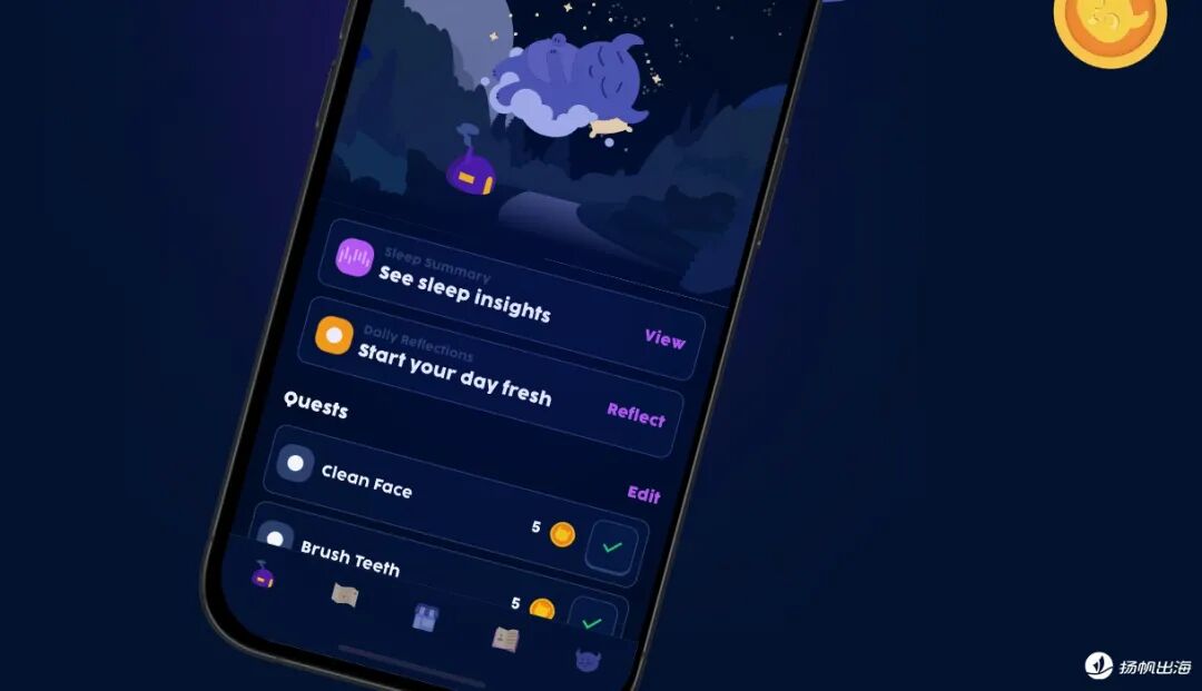 不过,有别于芙崽“陪伴”的使用目标,Momo Self Care的核心目的是通过养成虚拟宠物的形式,让用户养成良好健康的生活习惯(任务驱动),进而成为更好的自己。因此,Momo Self Care格外强调正反馈,用户睡一个好觉、多喝一杯水,或者记录下自己的情感都能获得金币,反之,即使没有完成任务也不会给用户提供负面情绪。