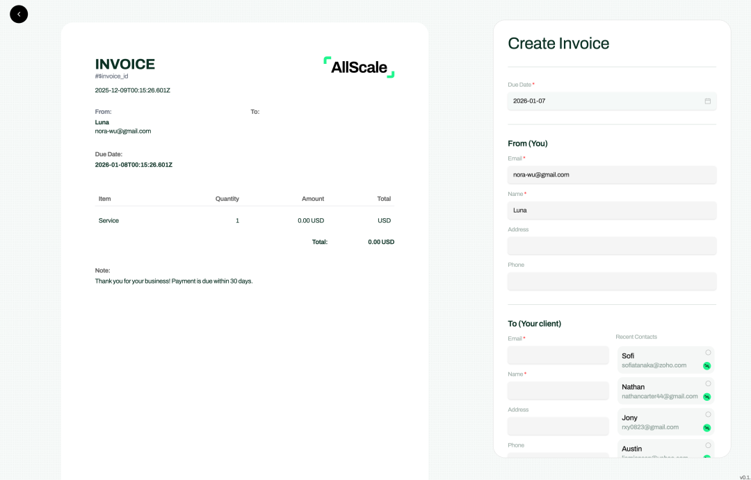 AllScale 把切入点放在这类被金融体系天然忽视的“轻量经营活动”。产品的核心并不是替代银行,而是提供一个能够承接小额、高频、跨时区协作的专业工具层:用户可以在同一套界面下生成带税率、备注和折扣的账单页,跨境付款以秒级完成,对应的记录会自动归档到客户或项目下;团队成员可以按角色查看流水、管理客户、发起账单,而不必先去预设一个与业务阶段严重不匹配的庞大结构。它更像是一套专为轻量业务设计的“跨境收付款工作台”,而不是传统意义上的企业账户。