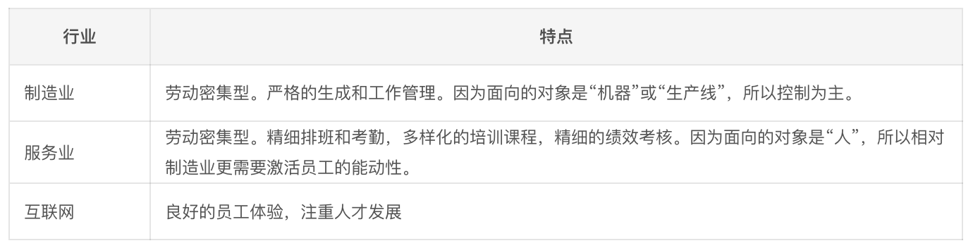 - 劳动密集型,更关注“效率”。人作为生成要素,人员流动高、数量大、标准化要求高。因此,快速招聘,规模化培训,严格管理等成为关注的点。