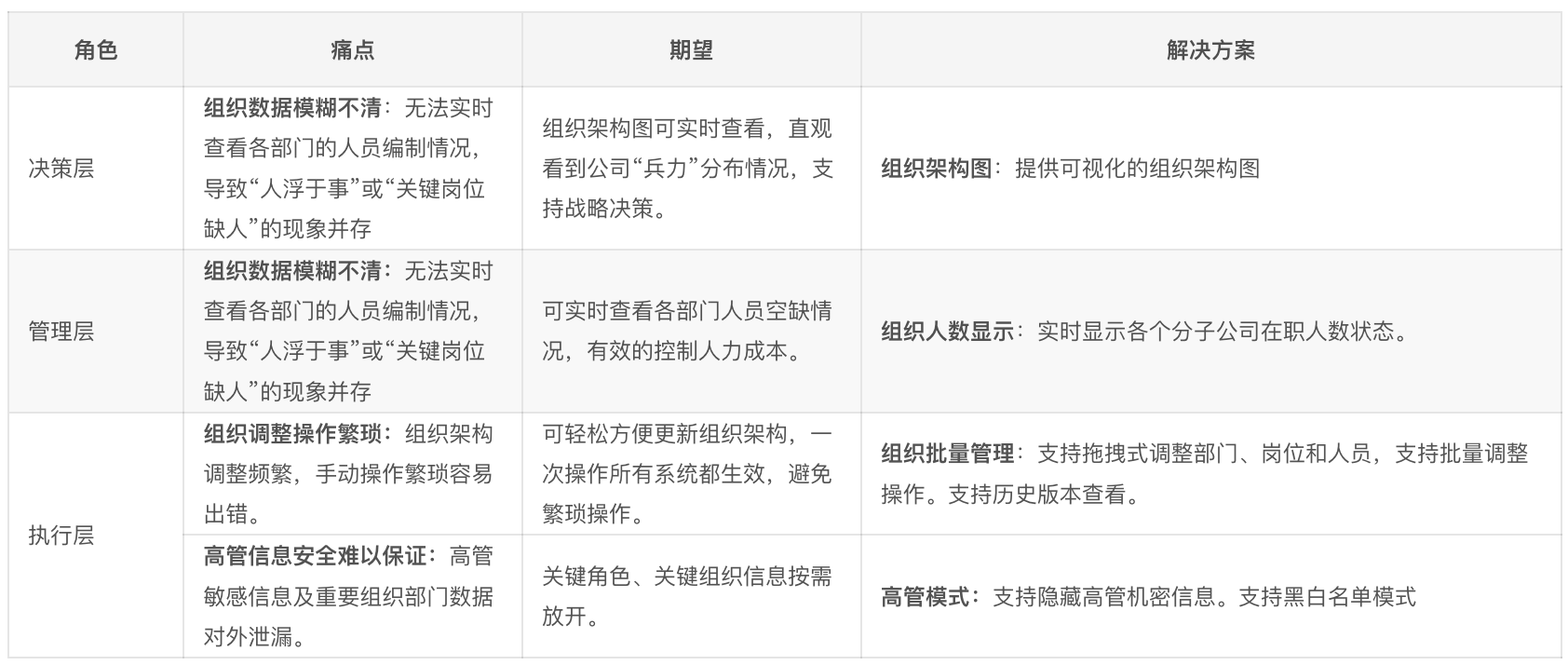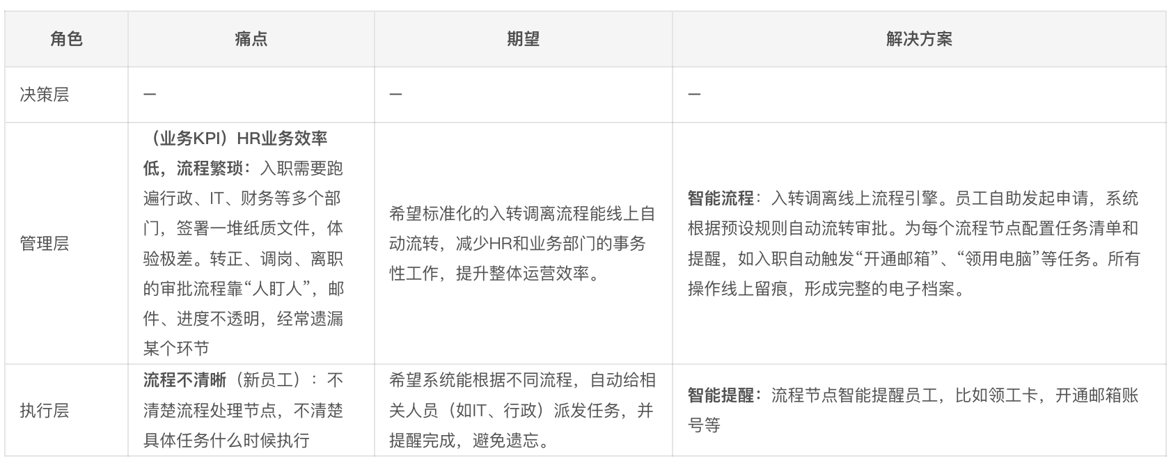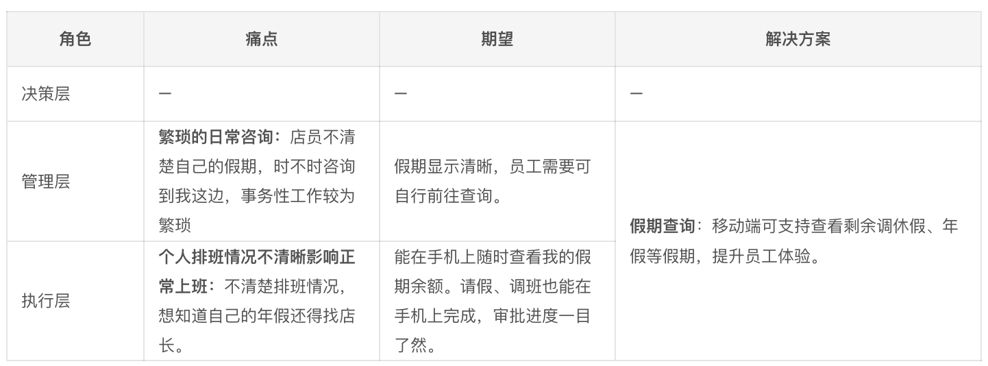 痛点: 复杂排班操作、日常高频的入转调离处理、支撑员工日常咨询类工作。