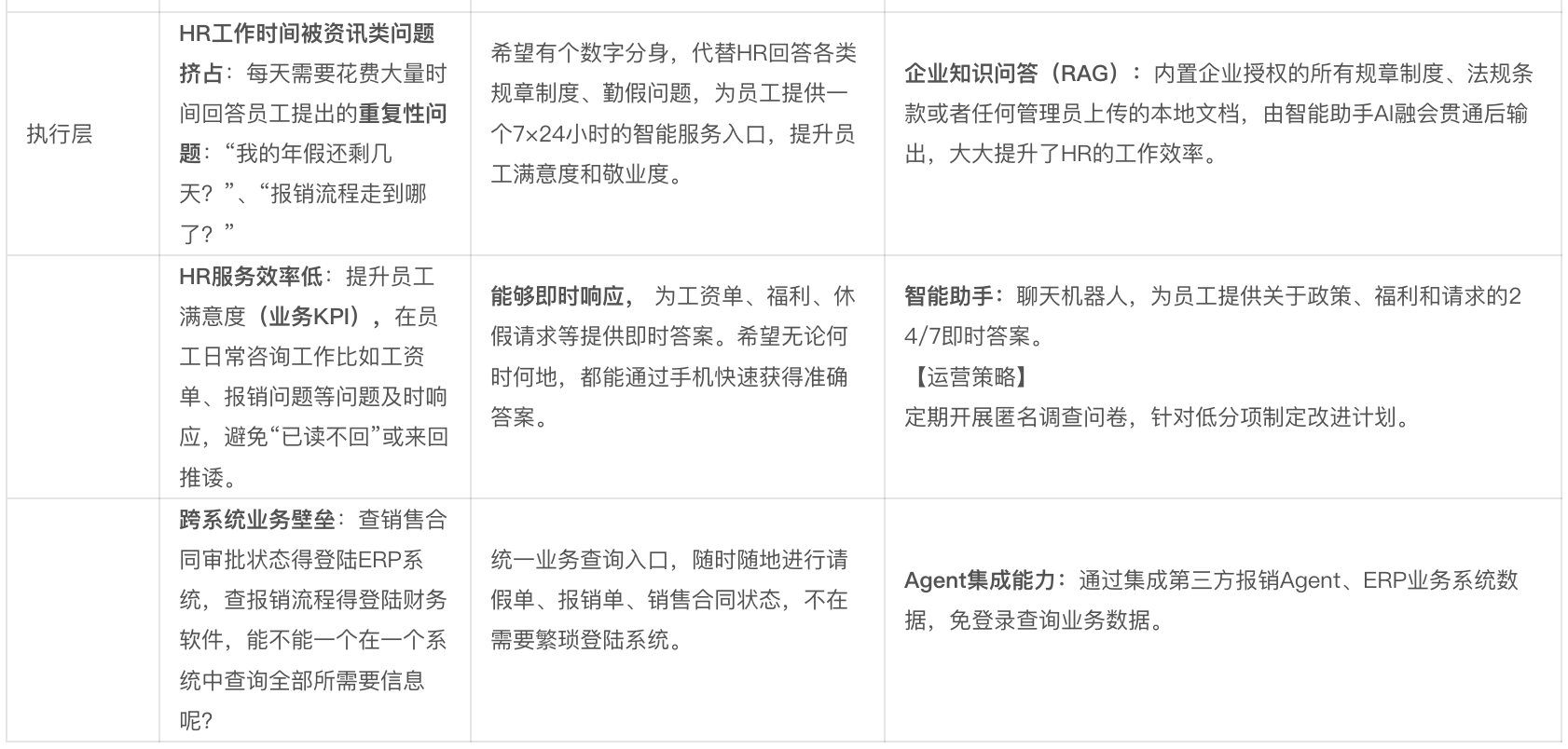 核心亮点为AI人事助手:通过智能问答提升员工体验;以智能任务处理自动化HR流程;并通过Agent集成连接chatBI、费用报销等系统,打破信息孤岛,打造一站式服务。