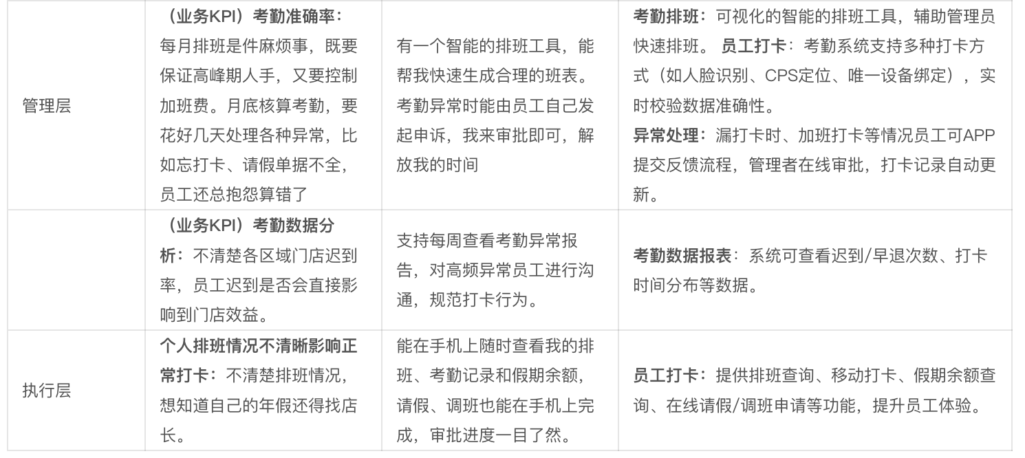痛点: 考勤打卡、换班申请、请假、查询自己的考勤、假期、工资条等信息。