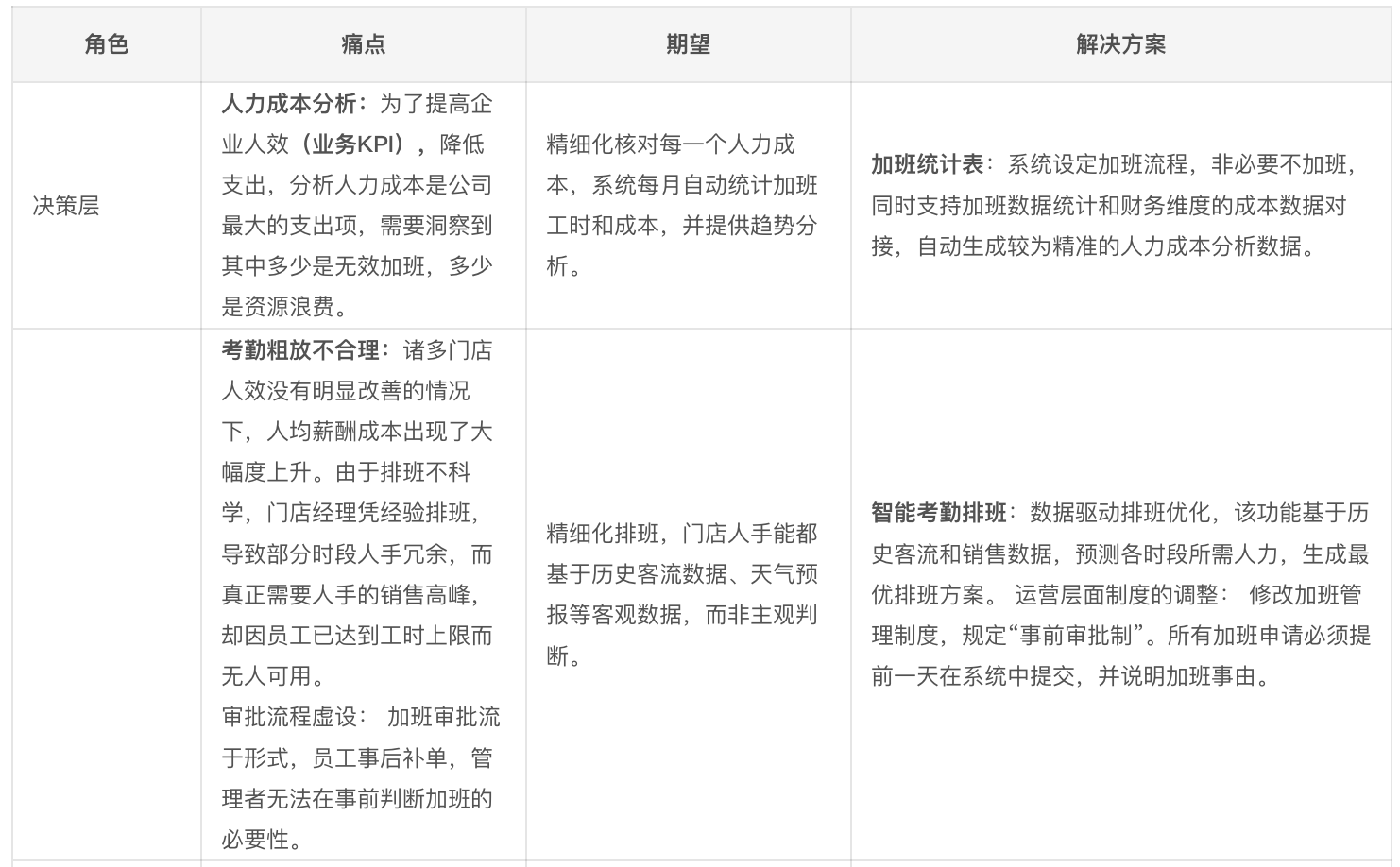 痛点: 人事数据报表不透明、不清晰,关注的包括区域人力成本、区域编制管理、考勤排班管理。