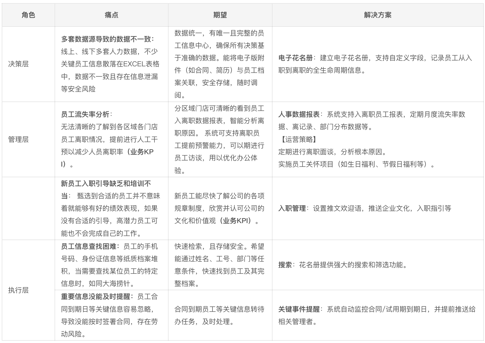 痛点:人事数据报表不透明、不清晰,关注的包括成本分析、离职率分析等。
