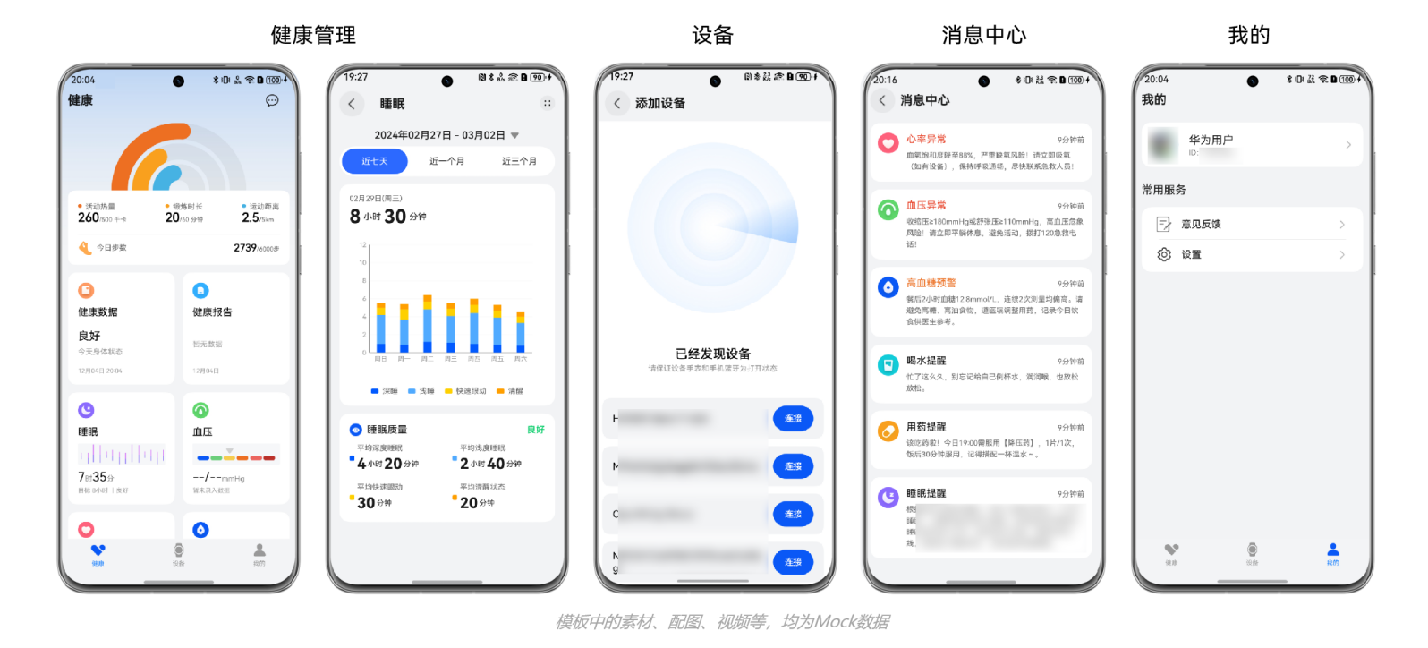 本模板为健康管理类应用提供了完整的开发框架,模板主要分健康、设备和个人三大模块。提供运动数据追踪、BMI与体脂率计算、多项健康指标监测(血糖、心率、血压、睡眠)、健康知识、数据可视化分析等功能。模板已集成华为账号、微信登录、应用更新、消息推送等服务,采用模块化架构设计,支持多设备适配,提供完整的状态管理和路由导航解决方案,只需做少量配置和定制即可快速实现健康管理应用的核心功能。