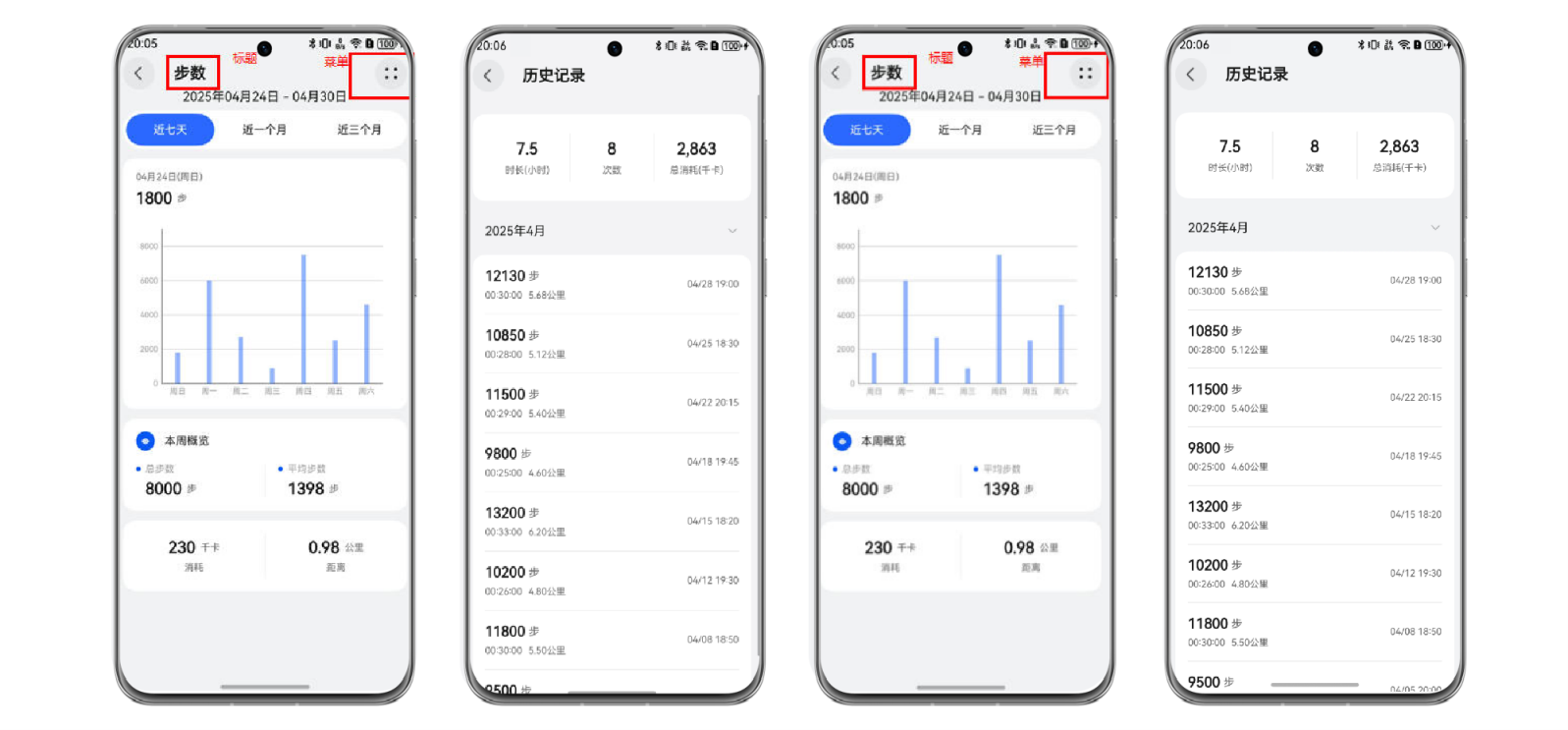 本组件提供了健康数据可视化能力,用于展示步数、心率、血压、血糖、睡眠等健康数据。提供6种专业健康图表组件,基于@ohos/mpchart图表库实现,支持日/周/月视图切换,展示步数趋势和统计数据,按月份分组展示历史步数记录,自动计算平均值、最大值、最小值等统计指标,智能分析数据趋势。