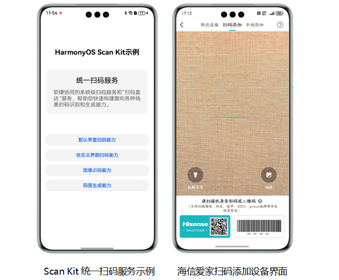 海信爱家App通过集成HarmonyOS的统一扫码服务(Scan Kit),实现了扫码识别准确率及响应效率方面的显著提升,为智能家居管理提供了更高效的扫码入口。Scan Kit采用多项计算机视觉技术和AI算法技术,不仅能实现远距离自动扫码,还针对多种复杂扫码场景(如暗光、污损、模糊、小角度、曲面码等)做了识别优化,大幅提升扫码成功率。此外,Scan Kit提供面向各种场景的码图识别和生成能力。用户通过扫码即可跳转至海信爱家App的对应服务页快速添加智能设备、完成电视端登录等,实现一步直达操作;同时也能通过文本或字节数组生成专属二维码,便捷完成家庭成员邀请等需求。