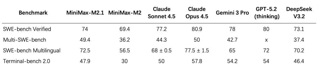 对比M2,M2.1的提升非常明显。在软件工程的核心榜单上,M2.1的表现超过了Claude Sonnet 4.5和Gemini 3 Pro。